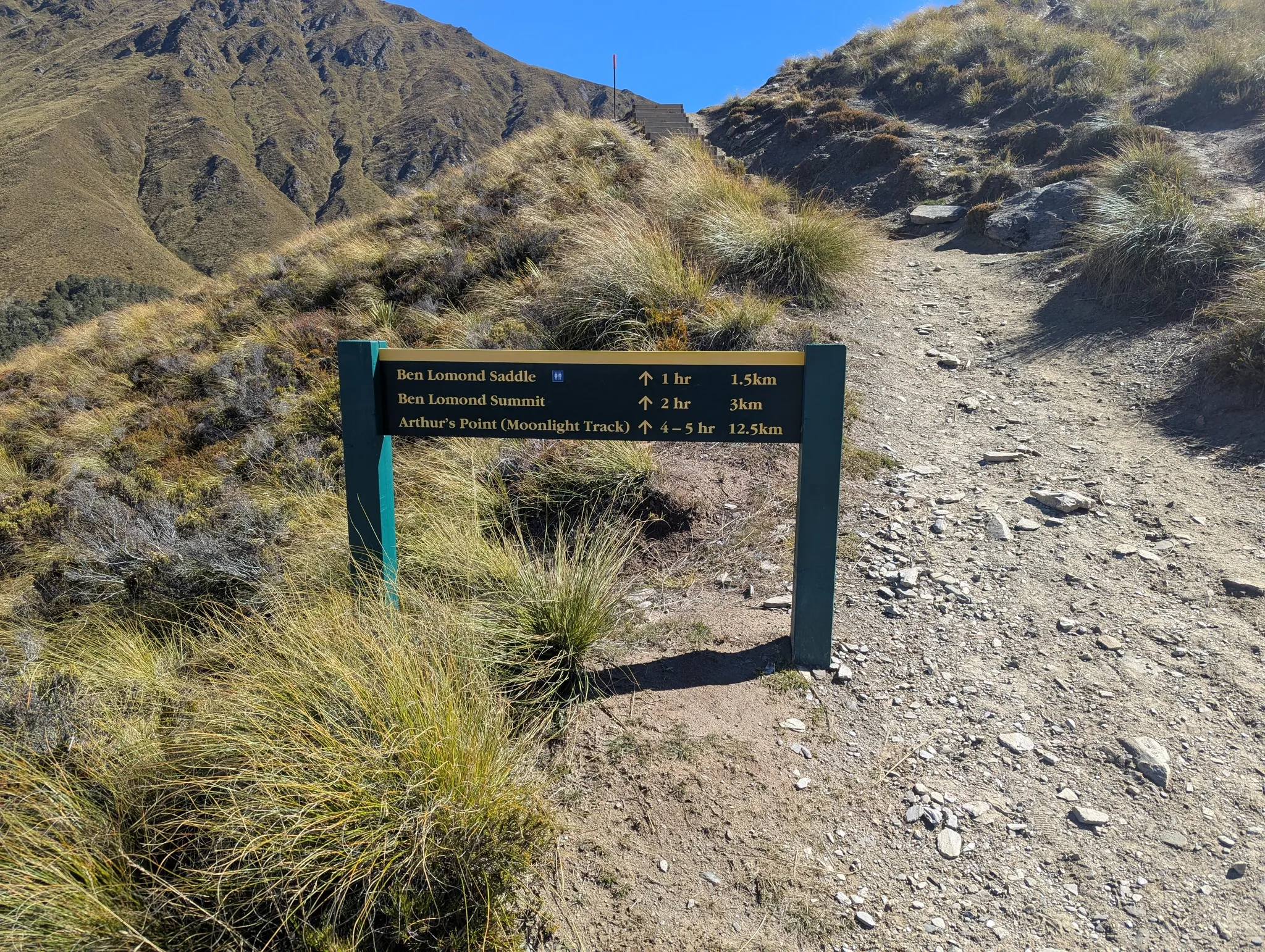 You’ll find restrooms at the top of the Skyline Gondola and another basic toilet roughly 100 meters before Ben Lomond Saddle. However, there’s no toilet paper, water, or hand sanitizer, so come prepared.